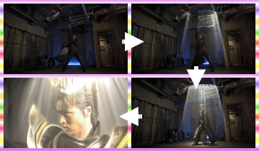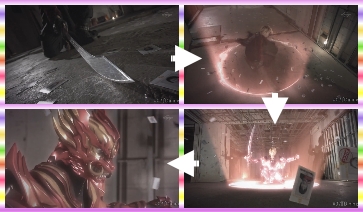 漸:劍觸地旋轉→打開圓形的入口→穿上鎧甲→變身完畢